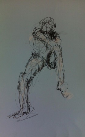 Desenho de movimento e modelação com lápis de carvão, lápis conté branco e tinta acrílica preta e branca em papel colorido