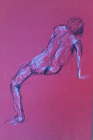 Desenho de movimento e modelação com lápis de carvão, lápis conté branco e tinta acrílica preta e branca em papel colorido