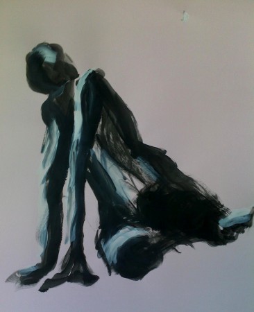 Desenho de movimento e modelação com lápis de carvão, lápis conté branco e tinta acrílica preta e branca em papel colorido