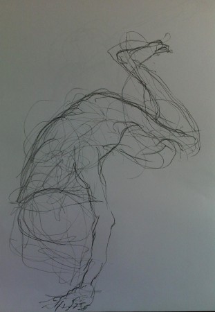 Desenho de movimento e contorno com lápis de grafite, lápis de carvão e conté branco em papel branco e colorido