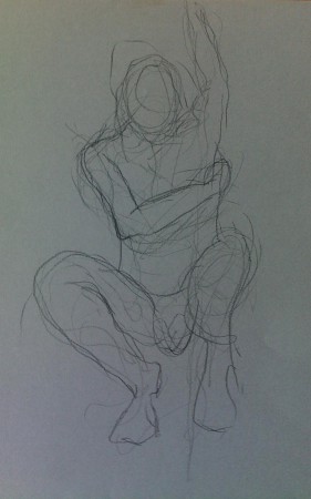 Desenho de movimento e contorno com lápis de grafite, lápis de carvão e conté branco em papel branco e colorido
