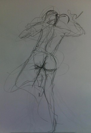 Desenho de movimento e contorno com lápis de grafite, lápis de carvão e conté branco em papel branco e colorido