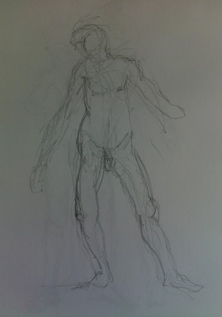Desenho de movimento e contorno com lápis de grafite, lápis de carvão e conté branco em papel branco e colorido