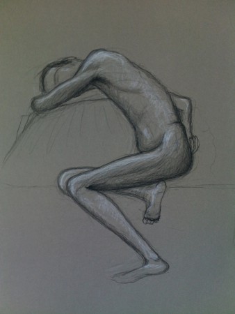 Desenho de movimento, contorno e modelação com lápis de grafite, lápis de carvão, barra litográfica e lápis conté branco