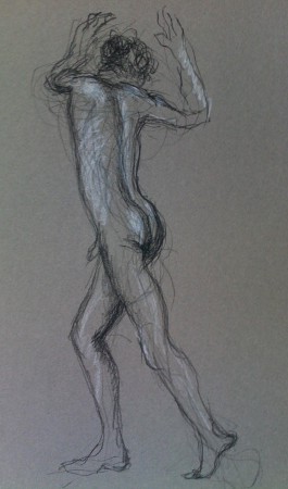 Desenho de movimento, contorno e modelação com lápis de grafite, lápis de carvão, barra litográfica e lápis conté branco