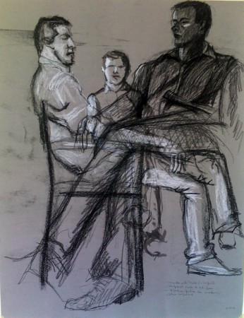 Desenho de movimento, contorno e modelação com lápis de grafite, lápis de carvão, barra litográfica e lápis conté branco
