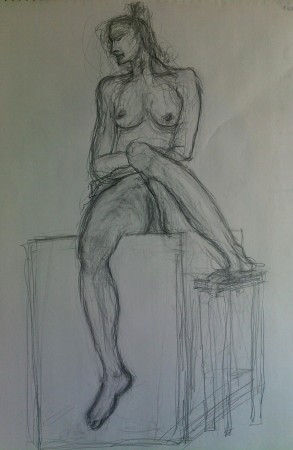 Desenho de movimento, contorno e modelação com lápis de grafite, lápis de carvão, barra litográfica e lápis conté branco
