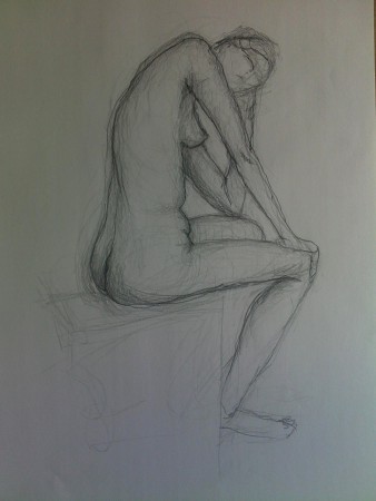 Desenho de movimento, contorno e modelação com lápis de grafite, lápis de carvão, barra litográfica e lápis conté branco